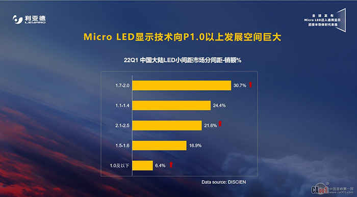 根據(jù)行業(yè)數(shù)據(jù)分析,傳統(tǒng)LED小間距市場中,受制于Micro LED顯示技術(shù)難度、價格、供應(yīng)鏈等因素的影響,P1.0以下產(chǎn)品市場占有率不到7%,P1.0-P2.0點間距的產(chǎn)品市占率接近80%,市場空間巨大。